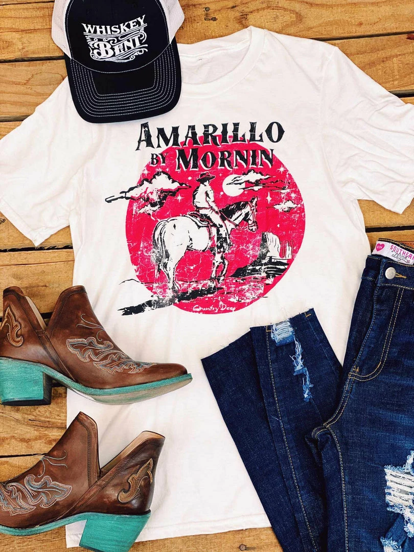 Amarillo By Mornin. We love this tee! This is a white tee featuring a cowboy looking into the desert. This tee runs true to size and printed on a unisex tee. It pairs perfectly with denim jeans and a denim jacket! It can also be dressed up with a Royal Sequin Duster.