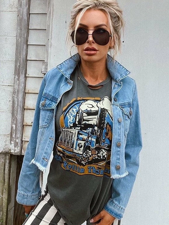 1970’s Vintage Rollin Thunder unisex distressed T shirt in a vintage faded black