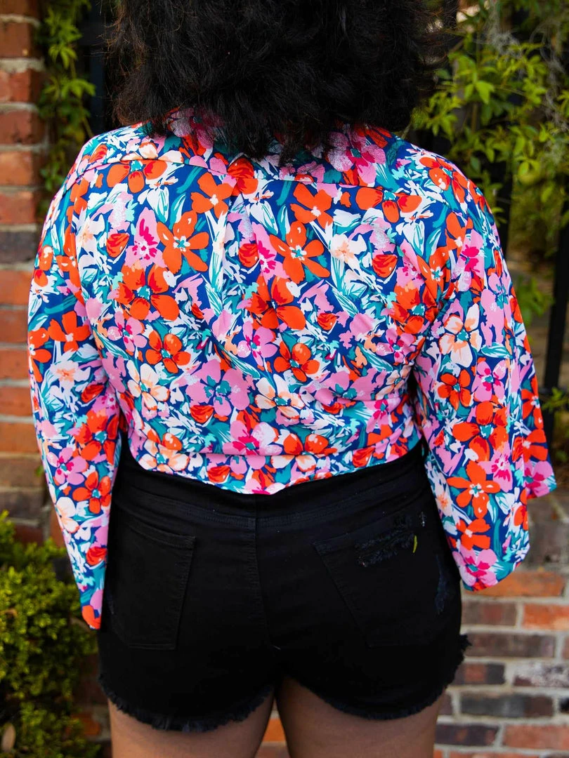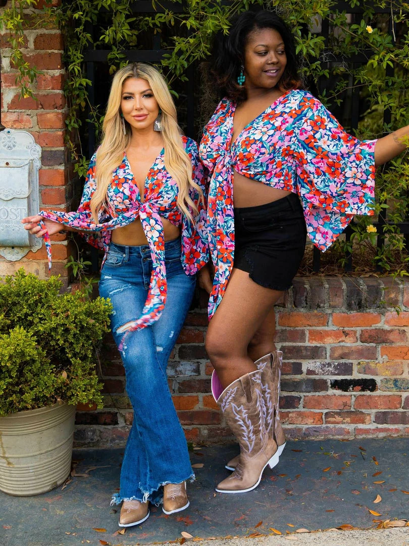 Talk about versatility! This top is going to be the hottest thing this spring and summer! This crop top features a beautiful floral print. It is very flowy and will keep you cool all day and night! If you don’t want to tie it up, you can wear it untied and add a tank under it. The bell sleeves are so comfortable and flowy! Great for all day wear! This top pairs perfectly with your high-waisted denim pants and your favorite denim shorts! Toss on your western cowgirl boots for a southern style or pair with wedges to dress it up!Â