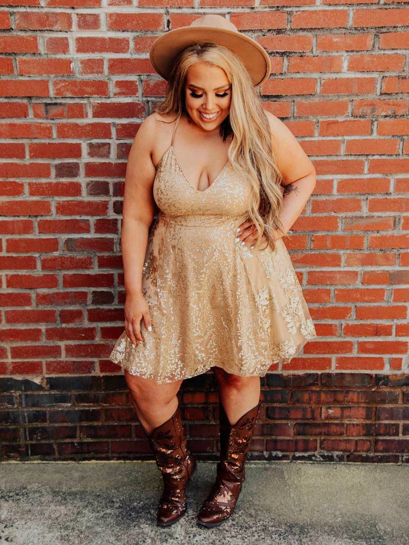 If you are going somewhere, you might as well be the best dressed The gold and neutral cross-back spaghetti strap Class and Sass dress features beautiful ornate sequin patterns throughout and a zipper back for a fun and glamourous look.Â