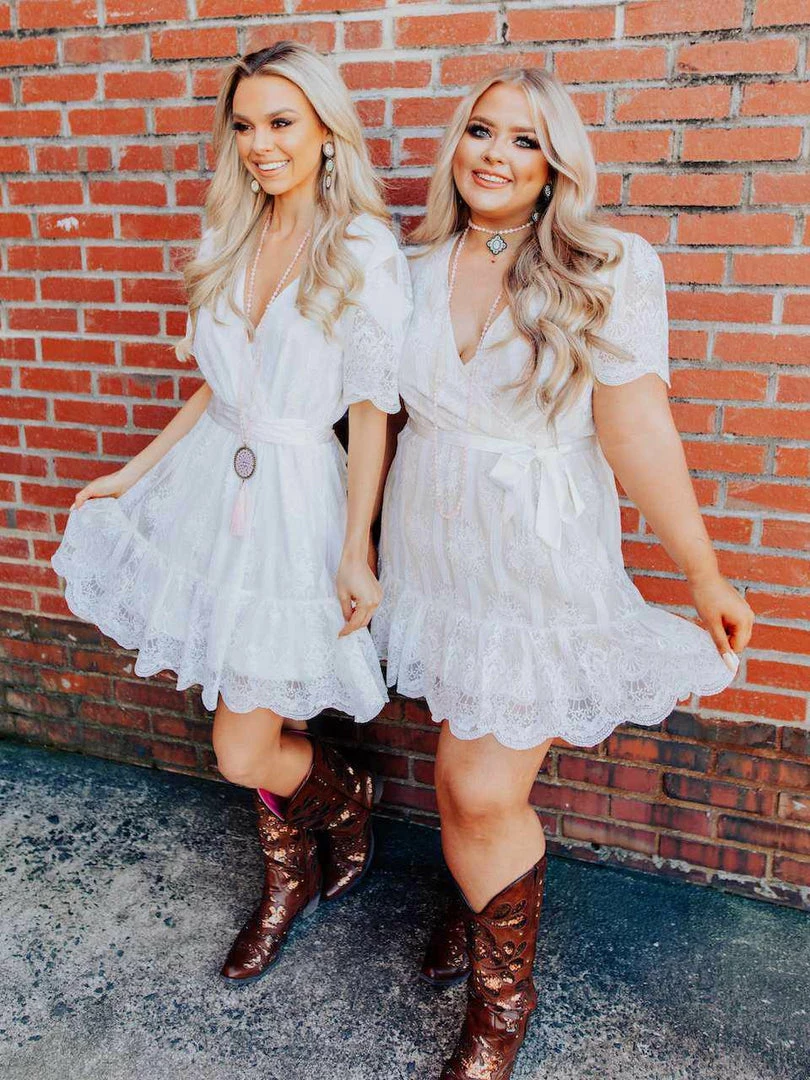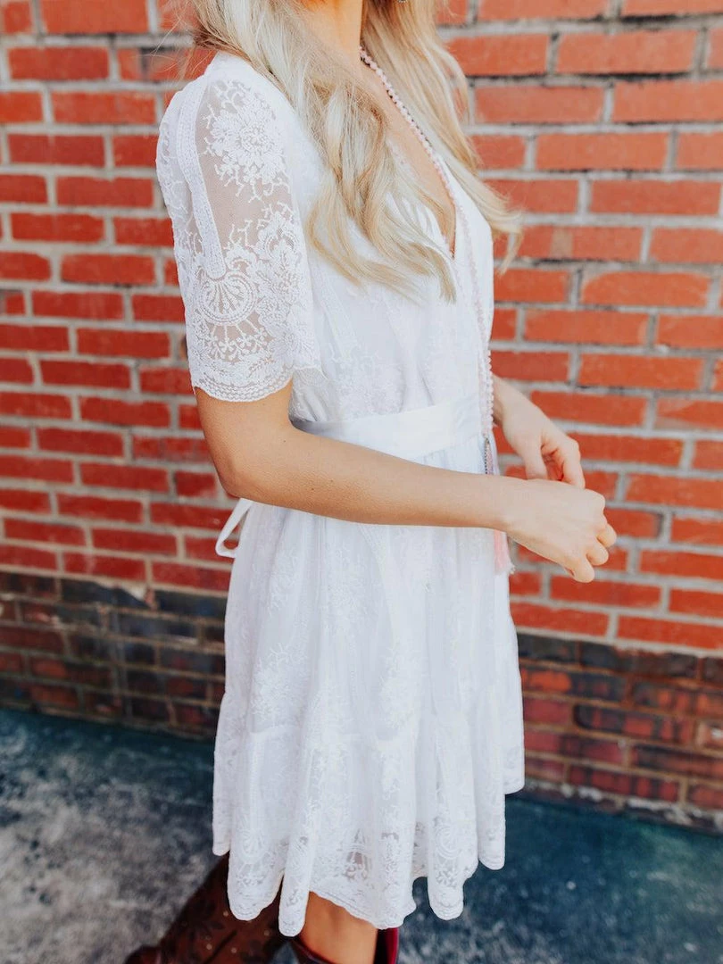 Where dainty meets fun. The Feeling Flirty dress features short sleeves, a floral lace applique overlay, and a satin ribbon belt that adds the perfect feminine touch.Â