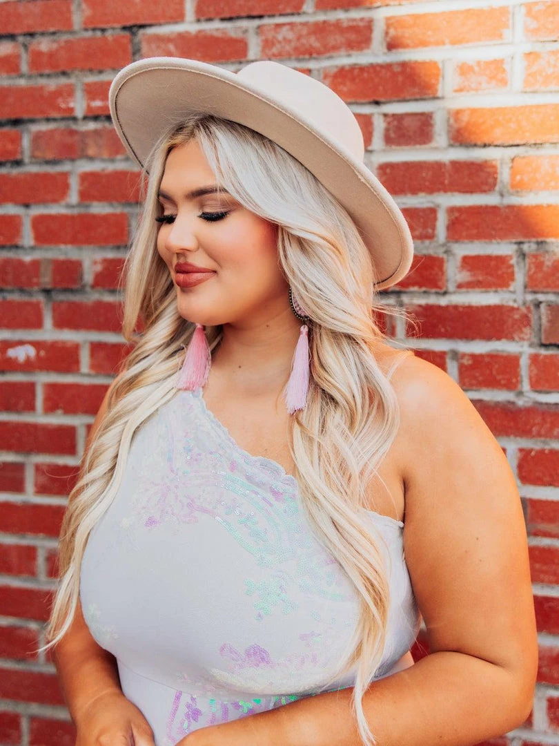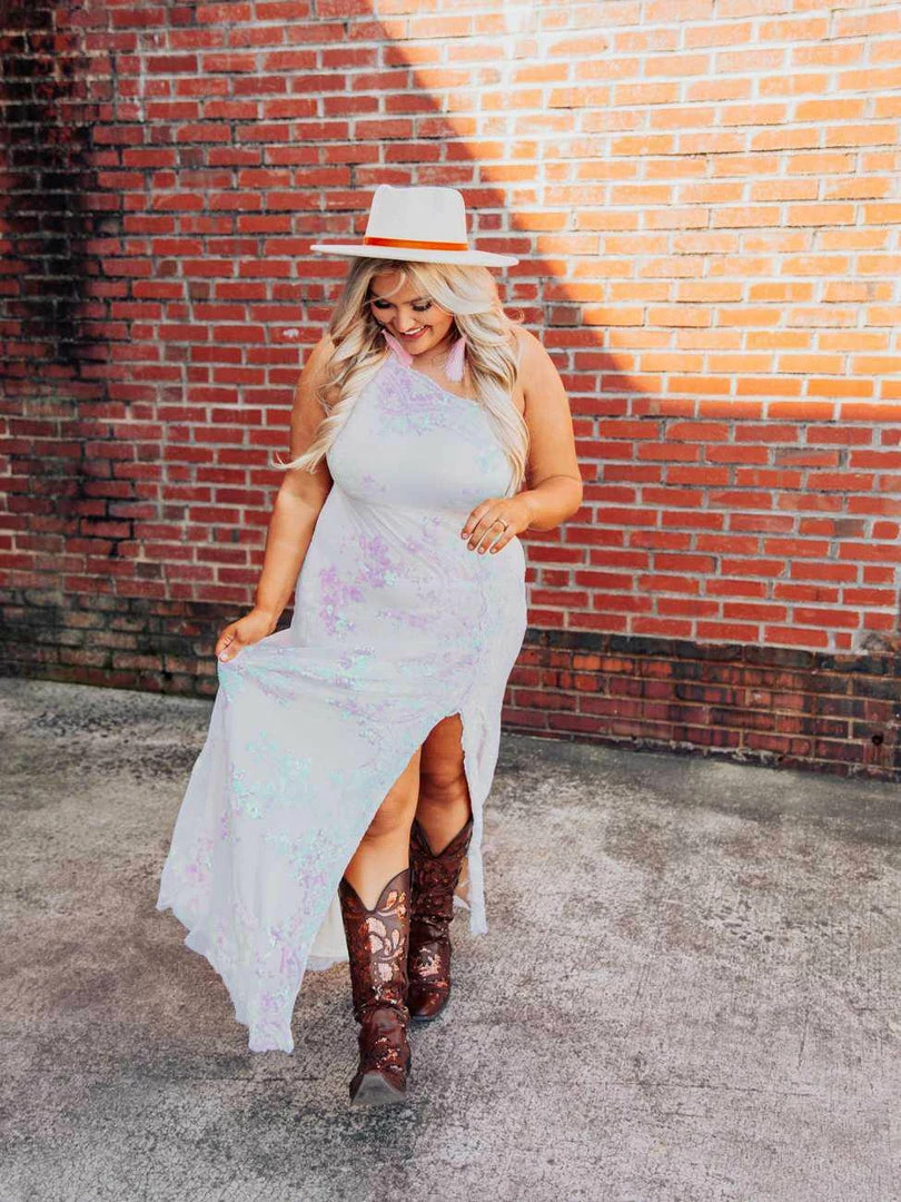 Lights. Camera. Action. With this dress, you are going to look like a movie star who is walking the red carpet! The “Hollywood Nights” Dress is a sequin dress, with a gorgeous sequin pattern and one-shouldered with a scalloped neckline. This dress does have a slit in the front for that extra sassiness! You are going to steal the show in this beauty! This material does have stretch and the dress is lined. “Hollywood Nights” is designed by our owner, Liz, and part of the Chics Collection. Nude liner.