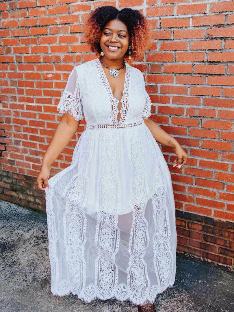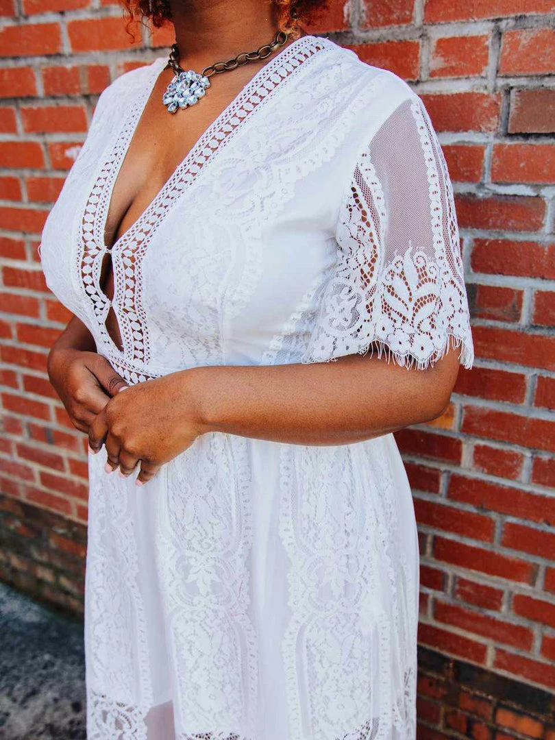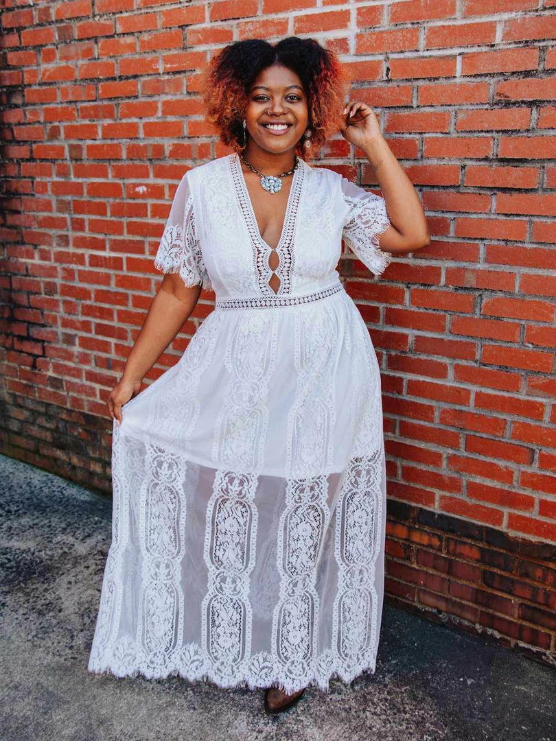 Sultry and just enough sheer, the Nobody But You long maxi dress is the go-to look for cool breezy spring days or hot summer nights. Featuring lace sleeves, eyelet lace trim, a zipper back, and a plunging neckline with a hook if you are wanting a bit more coverage. The illusion skirt with its unique floral design lace overlay makes for a flowy beautiful number. Part of our SFC collection, Curvy Chic approved, and designed by our owner Liz.