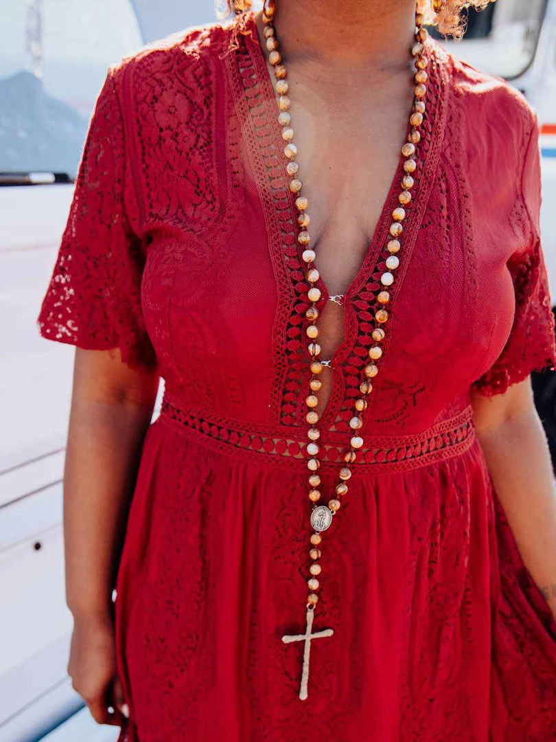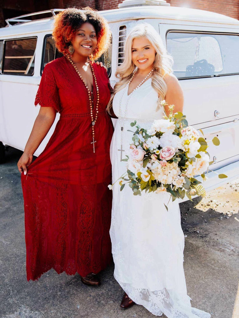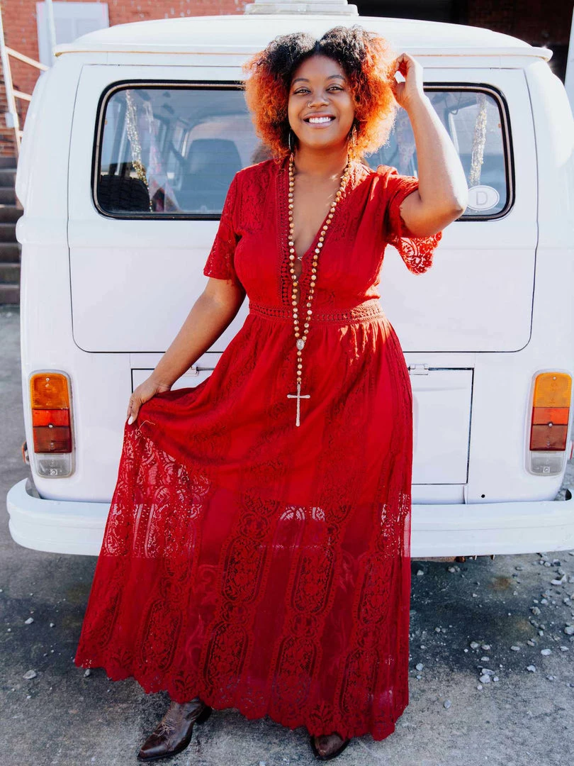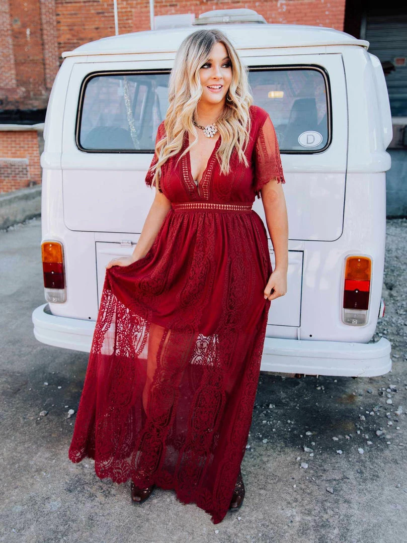 Sultry and just enough sheer, the Nobody But You long maxi dress is the go-to look for cool breezy spring days or hot summer nights. Featuring lace sleeves, eyelet lace trim, a zipper back, and a plunging neckline with a hook if you are wanting a bit more coverage. The illusion skirt with its unique floral design lace overlay makes for a flowy beautiful number. Part of our SFC collection, Curvy Chic approved, and designed by our owner Liz.