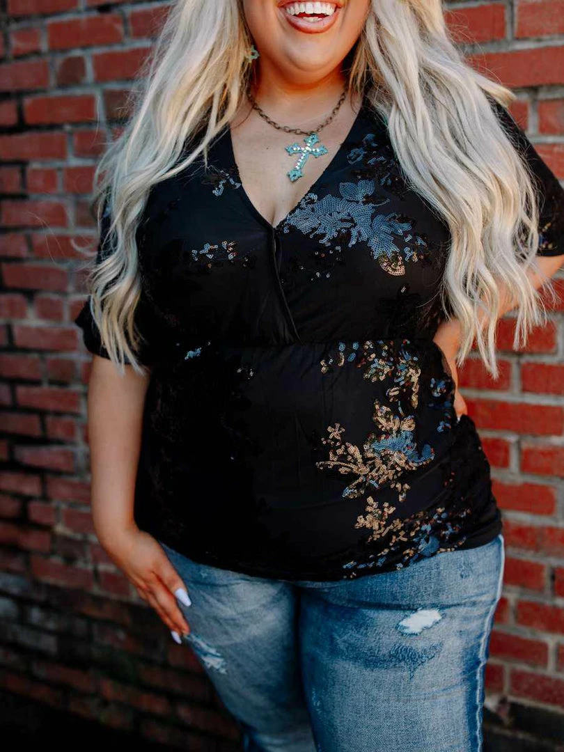 What a way to be a SHOWSTOPPER! Be a head turner while wearing the personal creation of Liz, the owner of Chics Collection! The Sequin Secret Top sparkles and shines. Just the top you need to shine in the middle of a crowded party, pub or bar! It features a V-neck neckline with a cinched waistline. Flattering to any body type!