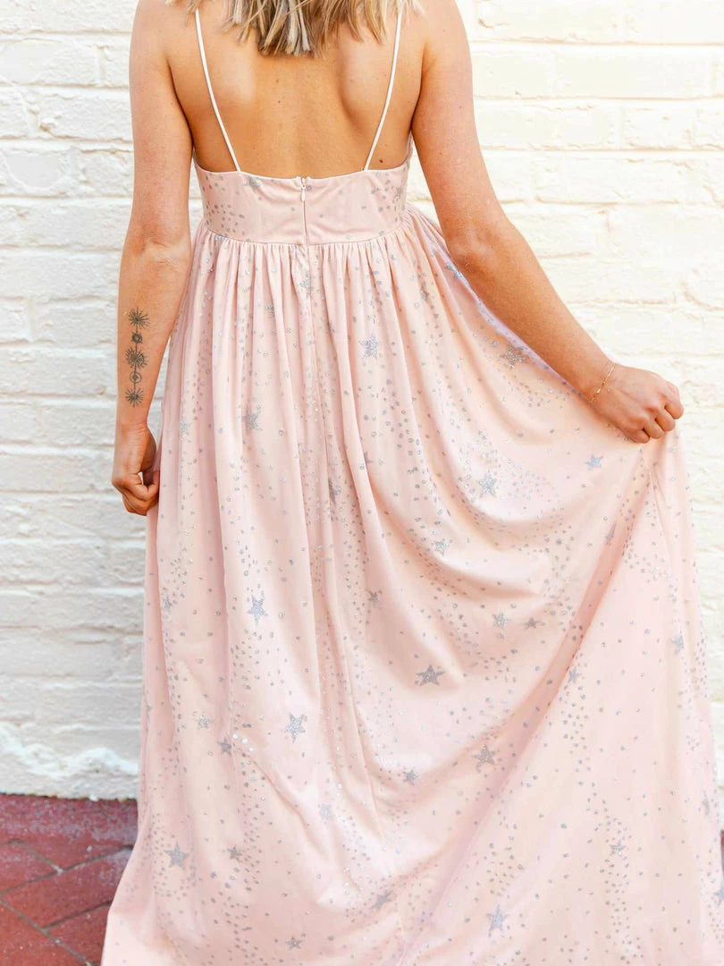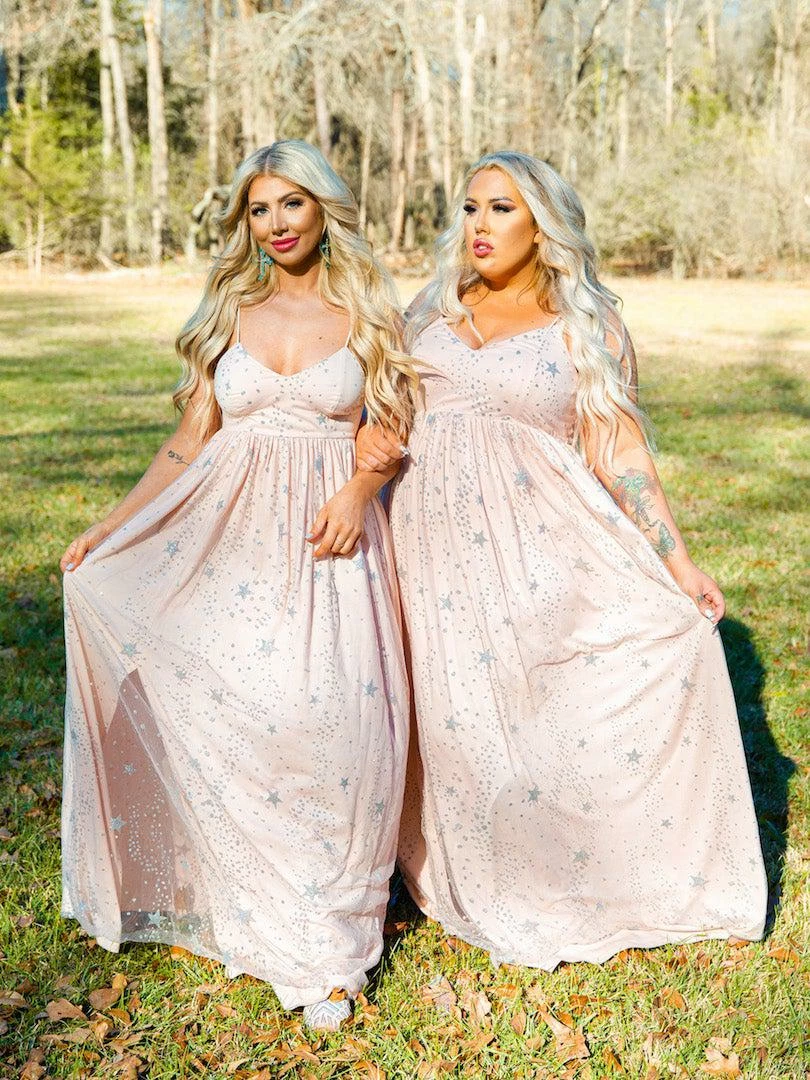 Shine bright in our “Reona Star” Dress! This dress is gorgeous and sure to make you sparkle for any occasion. Wear for date night, formal events or even photoshoots! True to size. Models are wearing a size XS & XL. Fitted through bust area.Â