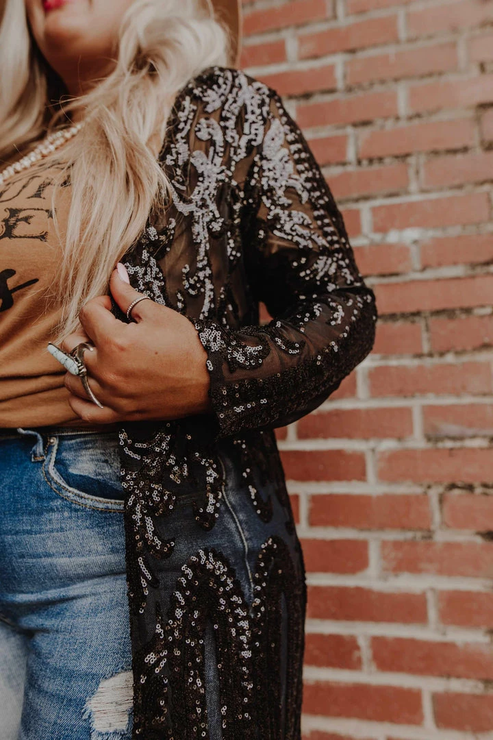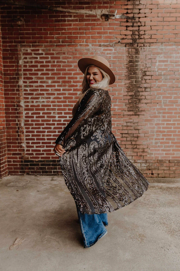 This handmade long kimono sequin duster is absolutely AMAZING! Great for special occasions, dates, or concerts. Even special for holidays like Christmas, New Years, and all year round events. With its lightweight flattering fit, it is sure to have you sparkle and shine anywhere you go! This piece is a LIMITED EDITION! Pair a duster with your favorite tops, bottoms or dresses for a sassy look!