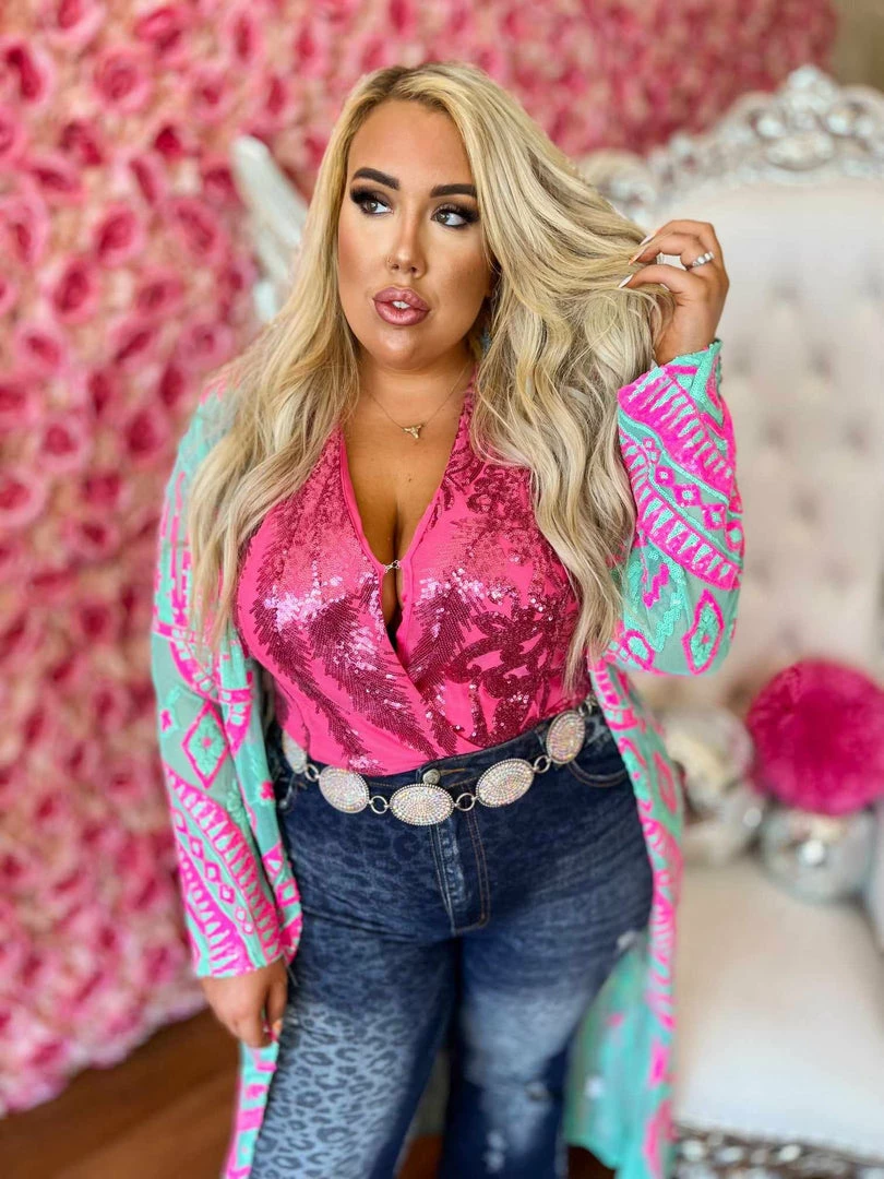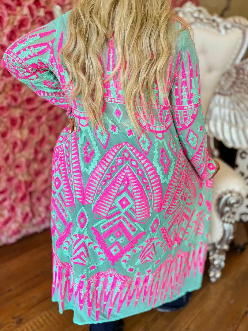The Royal Sequin Duster is absolutely stunning! The hot pink and mint combination is vibrant and luxurious. It’s perfect for making a statement at any event. Highly recommend!