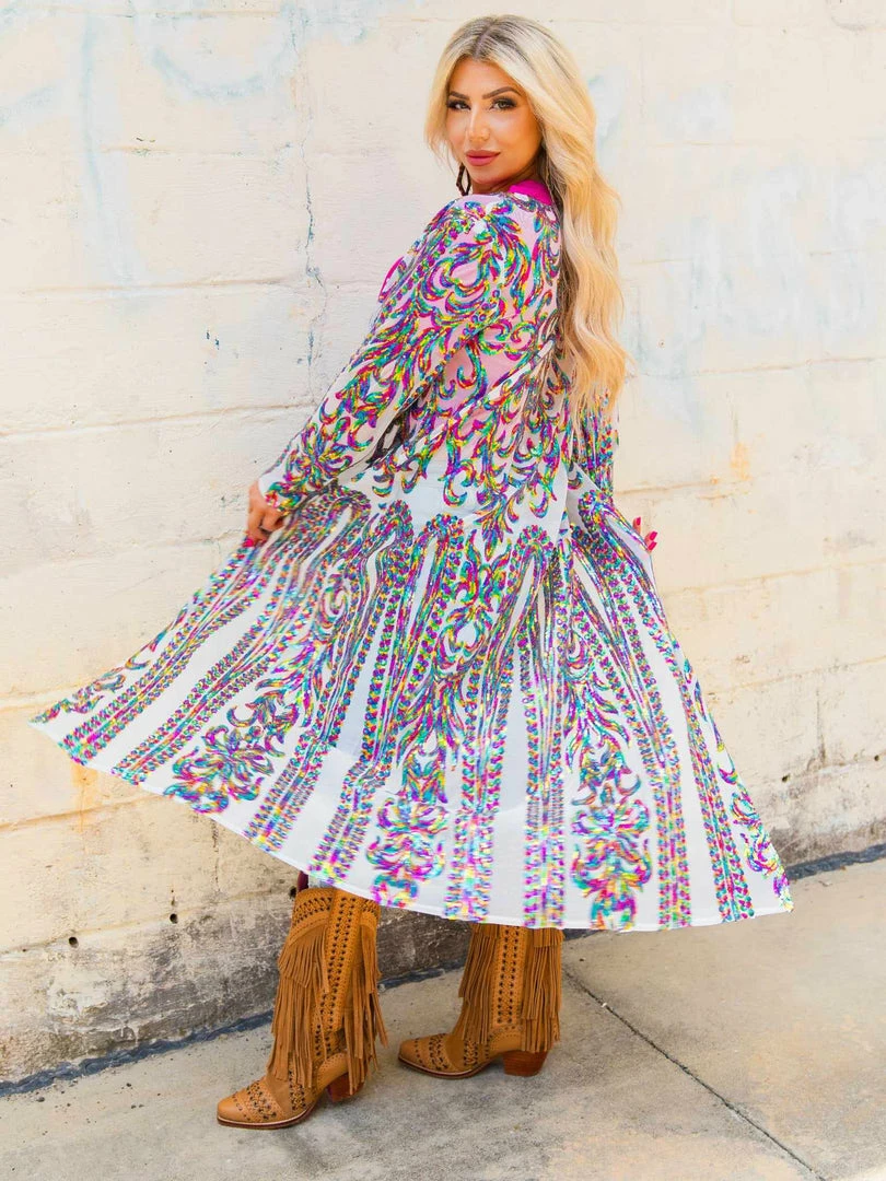I love this duster! The rainbow sequins are so fun, and the quality is excellent. It’s a bit long, but you can easily style it to suit your look.