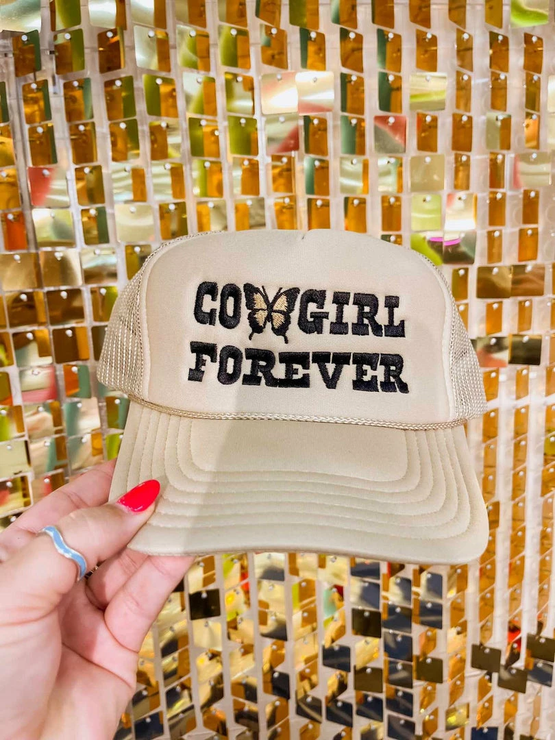 Trucker hats are so fun! Cowgirl Forever Hat. It’s great for those dreadful bad hair days or days you just don’t feel like doing your hair! Tan Trucker Hat.