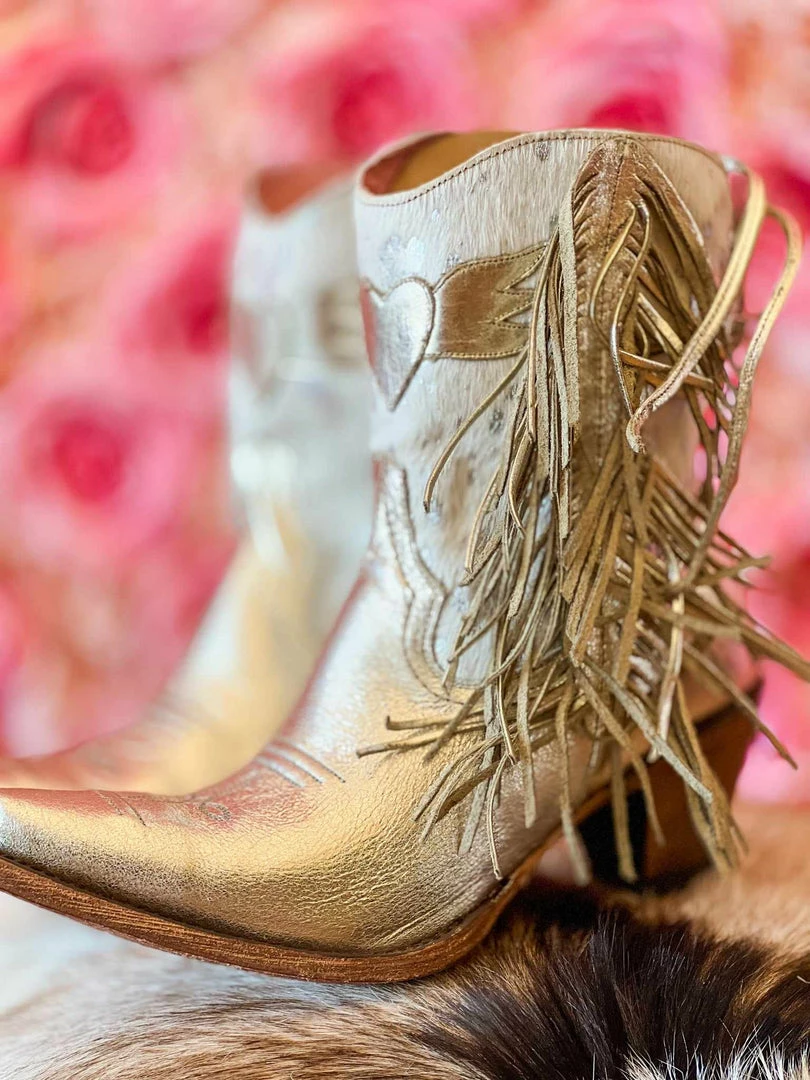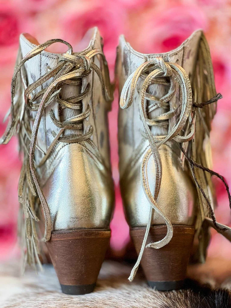 Shortie boots featuring an exclusive acid washed, hair on leather with metallic fringe, contrast inner lining, a side zipper, medium heel, and a stylish snip toe.