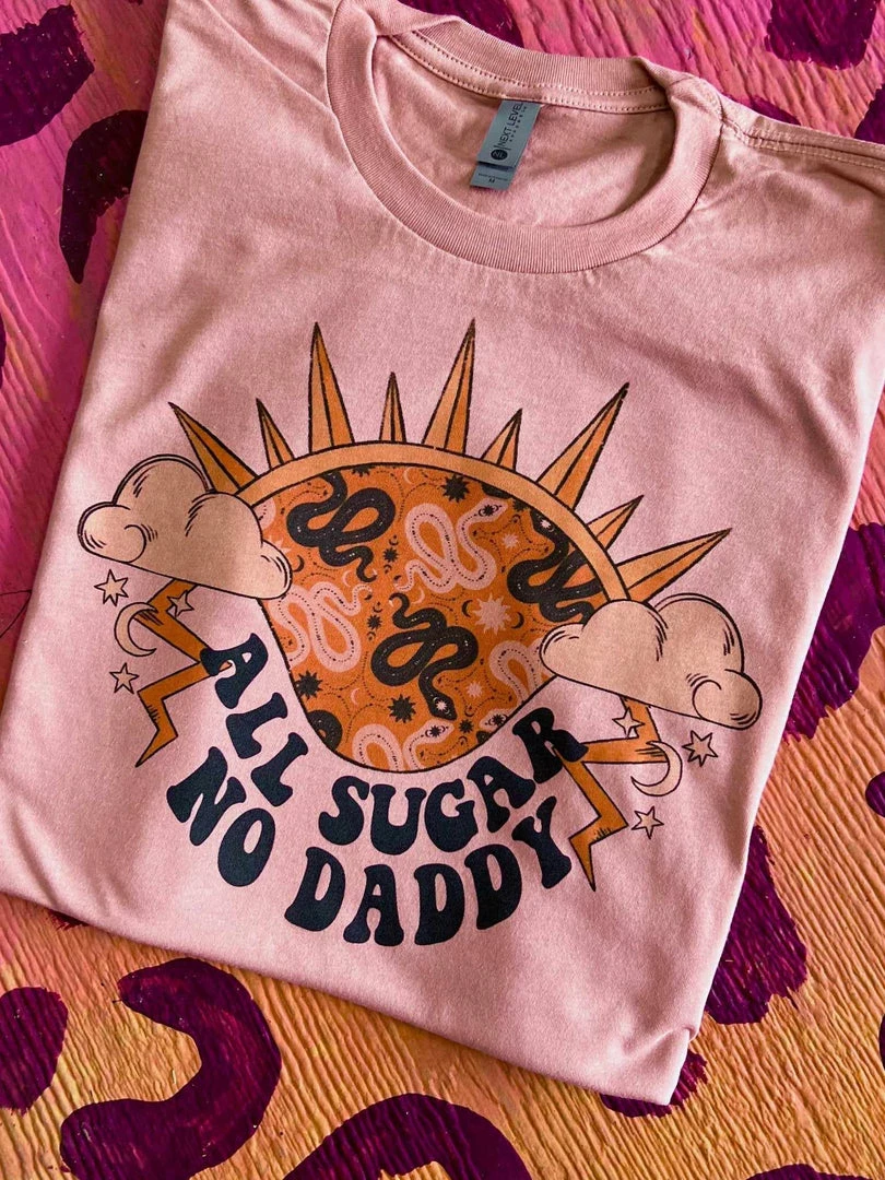 How cute is this t-shirt! All sugar – no daddy. Too funny! This tee is part of the Celestial Collection. Printed on a supersoft unisex tee. Natural/cream colored.