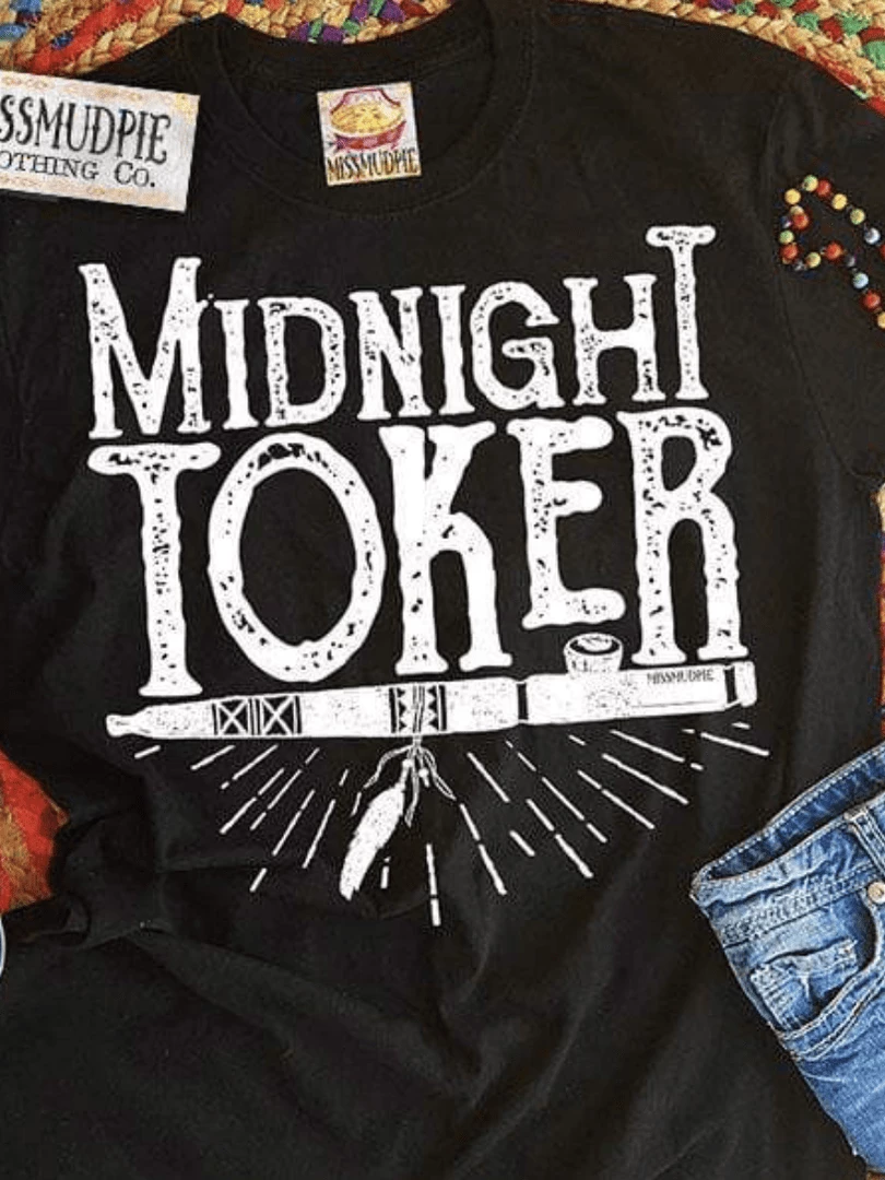 How cute is the midnight toker tee. Sit around a bonfire with your favorite friends jamming out to music and making the best memories with your people! This tee is printed on a soft style unisex black tee.Â