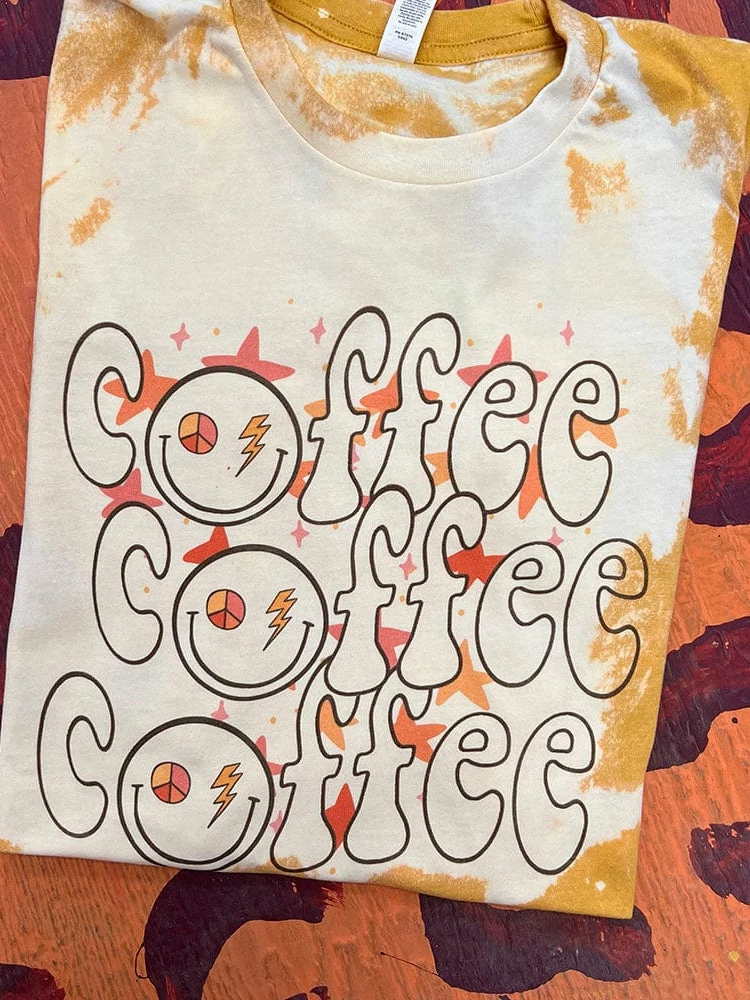 Perfect for the Groovy Chics who love coffee! How cute is this t-shirt! It is so groovy! This tee is part of the Groovy Collection! Printed on a supersoft unisex tee. Mustard bleached colored tee.