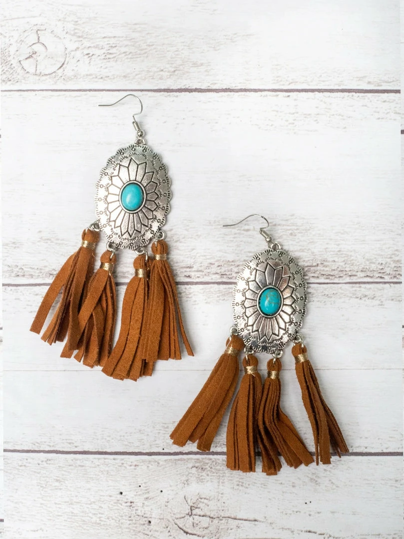 These beauties are bound to become our go-to concho tassel earrings! With brown textured tassels and a beautiful turquoise stone, these earrings are neutral enough to match any outfit!