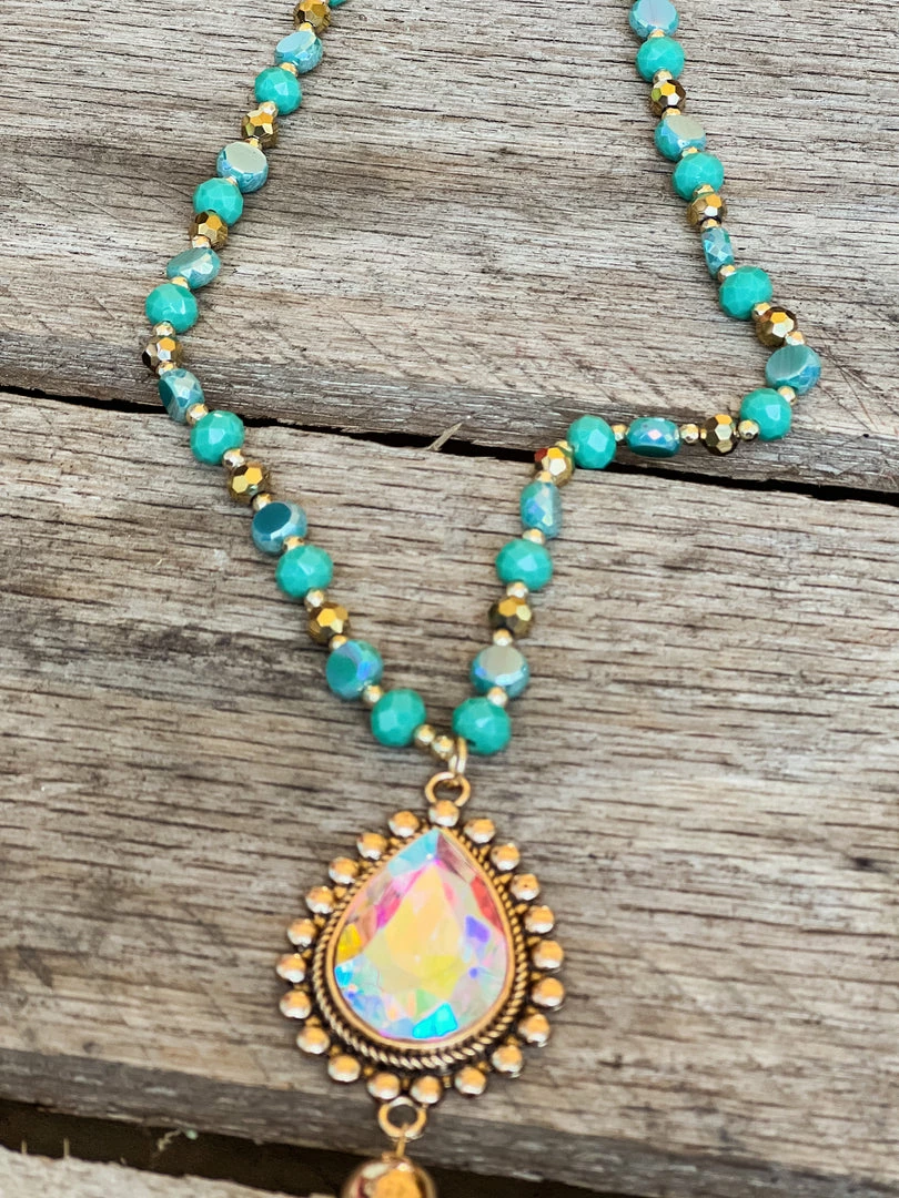 Our gold and turquoise crystal necklace is going to make your eyes pop no matter their color. And, it might just make other folks eyes pop too — right out of their faces when they see how bright you sine!