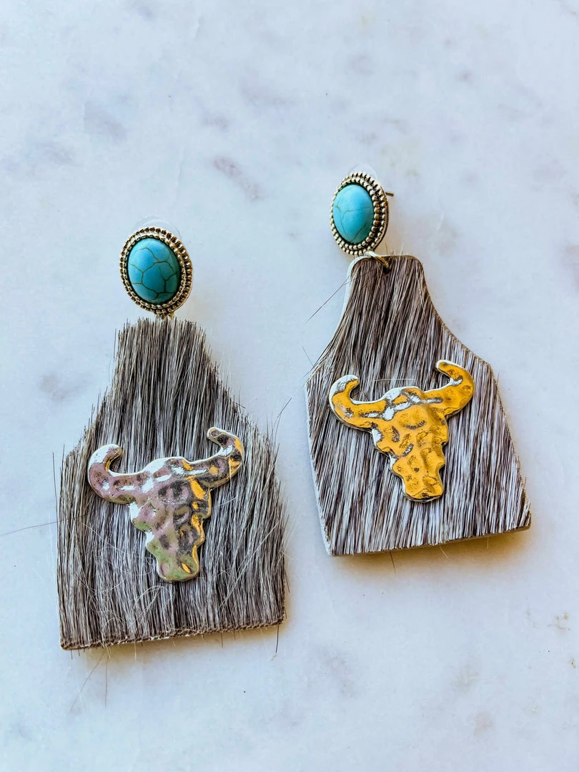 These rustic western style earrings come in cowhide adding awesome texture! And we can’t forget to add a pop of turquoise! These cowskull earrings are too cute and will match all of your favorite outfits!Â