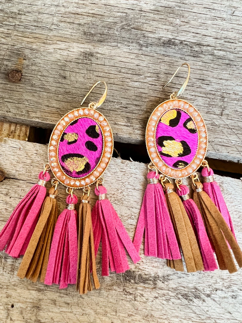 Fun and flirty pink leopard tassel earrings are the perfect earrings for a night on the town or a country concert! With leopard fur and leather tassels, these earrings have all the texture with a touch of bling!