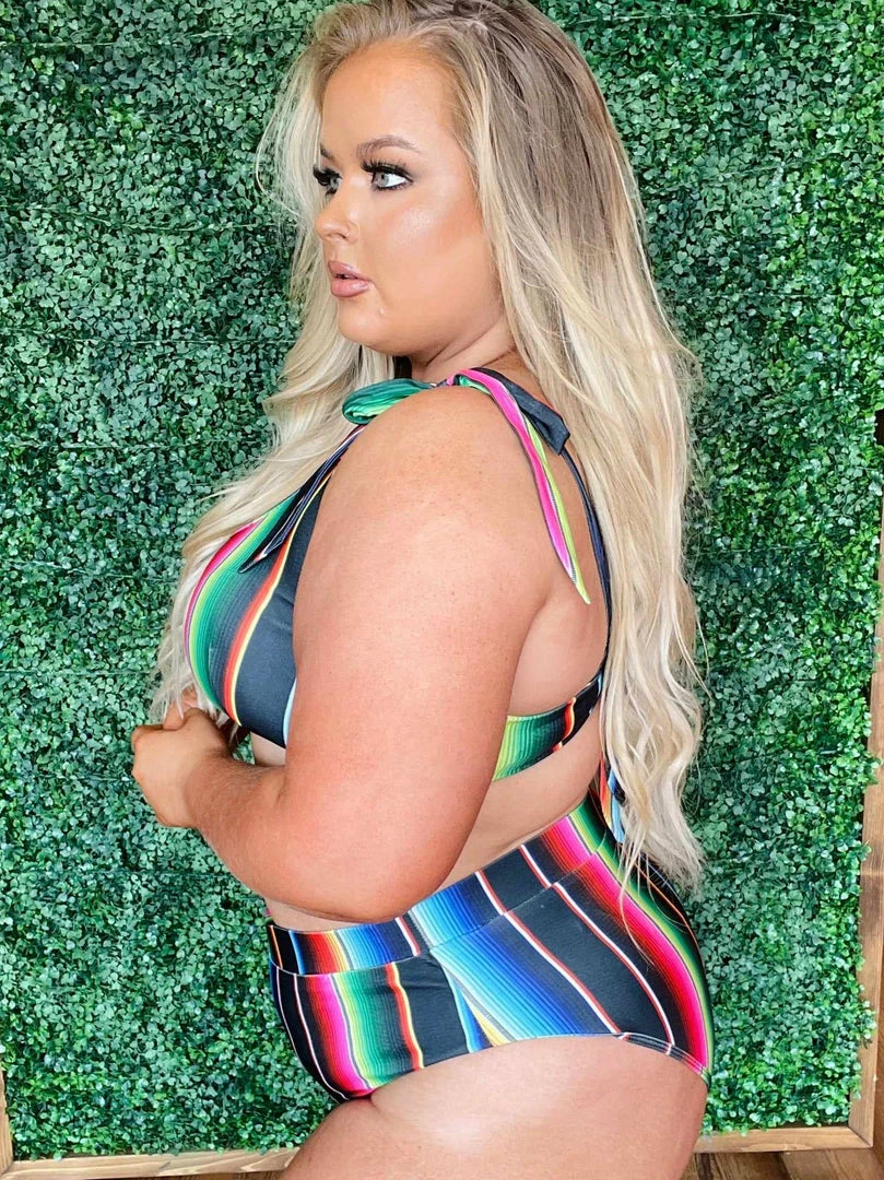 On trend high waisted bikini bottom keeps your tummy in and your figure on display! Sassy serape print with a thick band, these bikini bottoms can be mixed and matched with a variety of tops for a new look every time!