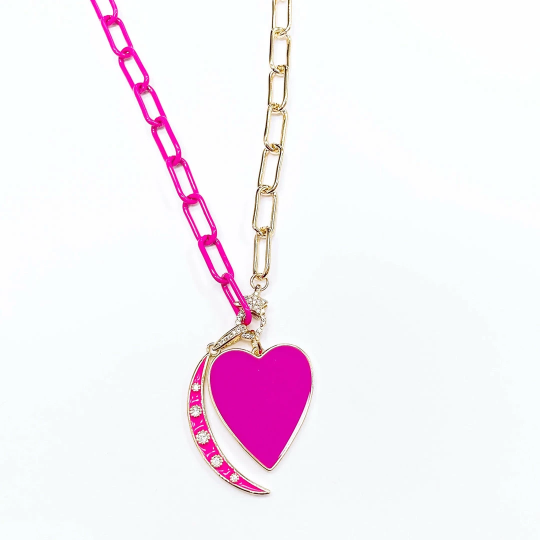 This sweetheart of a necklace features 2 pendants -a crescent moon with twinkling rhinestone inlay and shiny enamel heart!